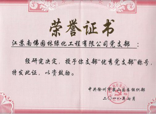江蘇南佛園林綠化工程有限公司在2018年度黨建工作中成績優(yōu)異,業(yè)績突出,榮獲“優(yōu)秀黨支部”榮譽稱號。