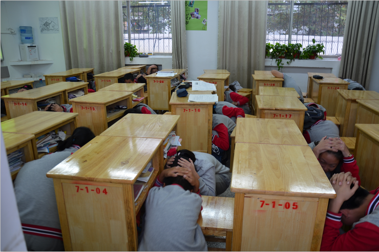 16點(diǎn)40分,隨著校園廣播警報(bào)鳴笛聲一響,演習(xí)開始了。各班班主任立即組織學(xué)生采取自救措施:迅速抱頭、閉眼、躲在教室內(nèi)各自的課桌下或課桌旁,盡量蜷曲身體,降低身體重心,保持安靜,聽從指揮。當(dāng)校園廣播發(fā)出疏散指令時(shí),各班學(xué)生在老師的帶領(lǐng)下,快速有序地經(jīng)過安全出口下樓,全校220名學(xué)生安全疏散到操場(chǎng)上班級(jí)集結(jié)位置僅用時(shí)1分05秒。