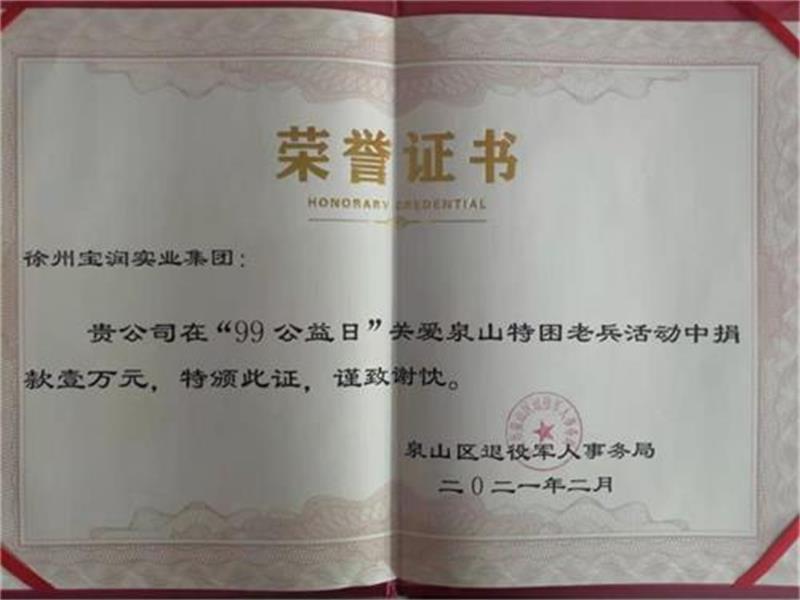 徐州寶潤實業(yè)集團積極圍繞市委、市政府中心工作,踐行社會主義核心價值觀,營造“人人參與、人人慈善”的良好生態(tài)環(huán)境,響應2020徐州市“99公益日”主題為“攜手慈善愛滿彭城”的活動號召,于“99公益日”當天的“關愛泉山特困老兵”活動中捐款一萬元整。