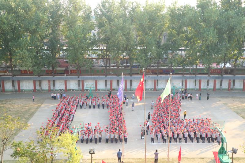 在《歌唱祖國(guó)》音樂(lè)聲中,全體師生手持小國(guó)旗自由快速進(jìn)入操場(chǎng)站成一個(gè)碩大的“70”,盛世華誕!“70”有我!