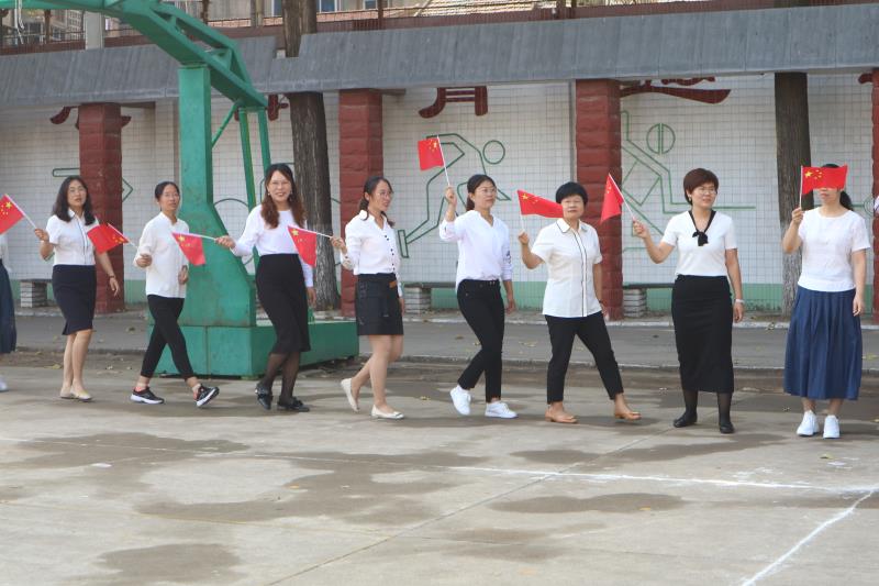 全校師生伴隨音樂(lè)節(jié)奏揮動(dòng)手中的小國(guó)旗,操場(chǎng)變成了紅色的海洋。