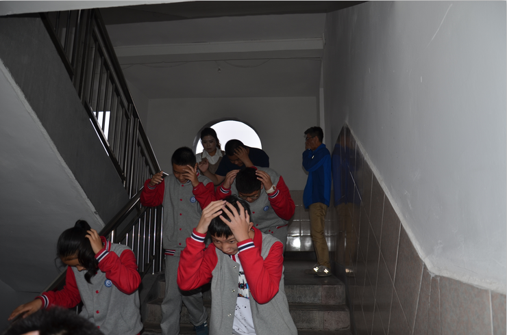 16點(diǎn)40分,隨著校園廣播警報(bào)鳴笛聲一響,演習(xí)開始了。各班班主任立即組織學(xué)生采取自救措施:迅速抱頭、閉眼、躲在教室內(nèi)各自的課桌下或課桌旁,盡量蜷曲身體,降低身體重心,保持安靜,聽從指揮。當(dāng)校園廣播發(fā)出疏散指令時(shí),各班學(xué)生在老師的帶領(lǐng)下,快速有序地經(jīng)過安全出口下樓,全校220名學(xué)生安全疏散到操場(chǎng)上班級(jí)集結(jié)位置僅用時(shí)1分05秒。