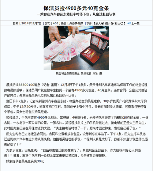徐州寶潤物業(yè)拾金不昧受稱贊